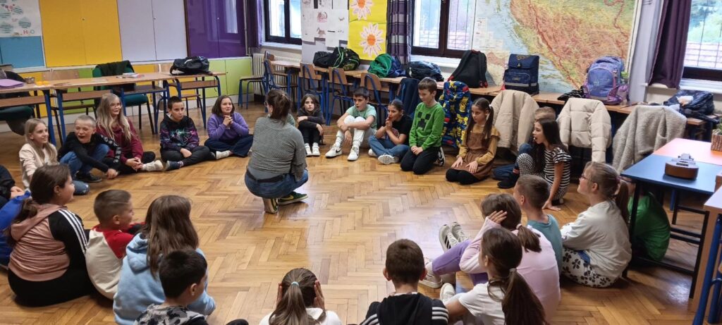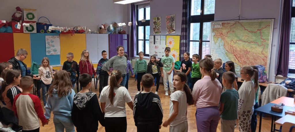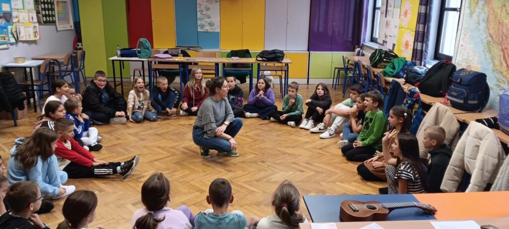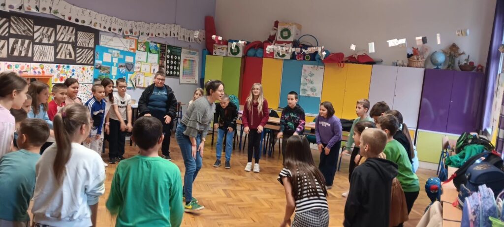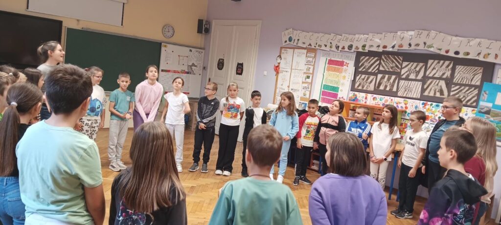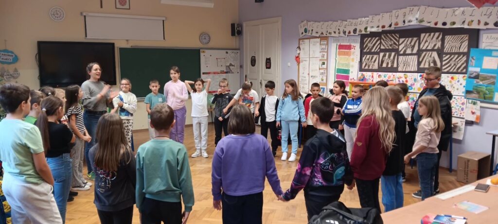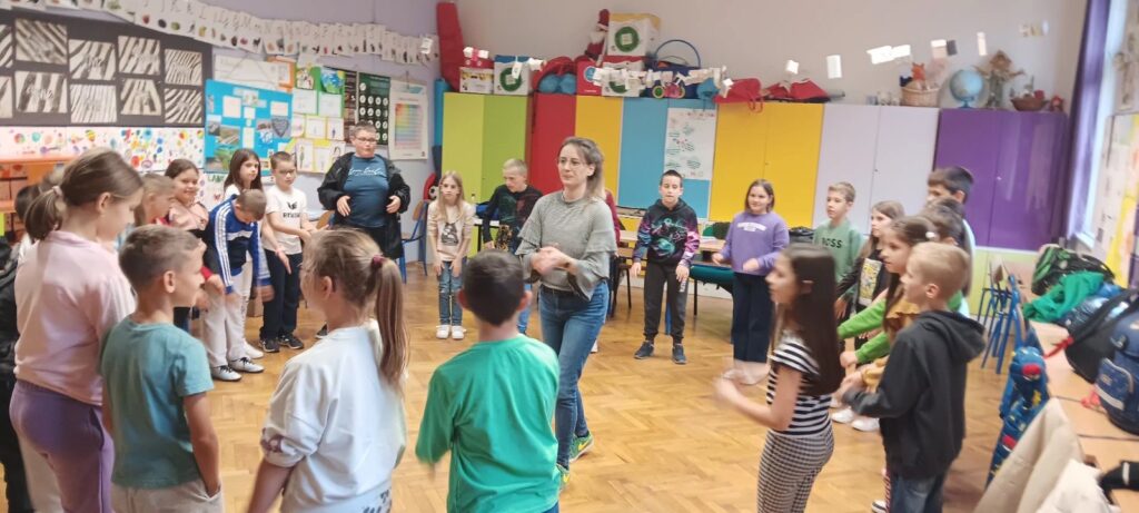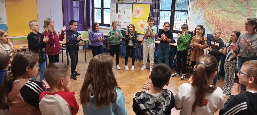 U uvodnom su se dijelu učenici kratko predstavili pjevajući svoje ime uz ritmičko pljeskanje. Time su razvijali osjećaj za ritam, pažnju i međusobnu povezanost u skupini. U nastavku su kroz vokalno-glazbenu igru istraživali različite melodije i pokrete ruku. Aktivnosti su postupno postajale složenije – učenici su u parovima plesali i pljeskali u stilu brojalica što je dodatno potaknulo njihovu suradnju, ritmičnost, koncentraciju i kreativno izražavanje.