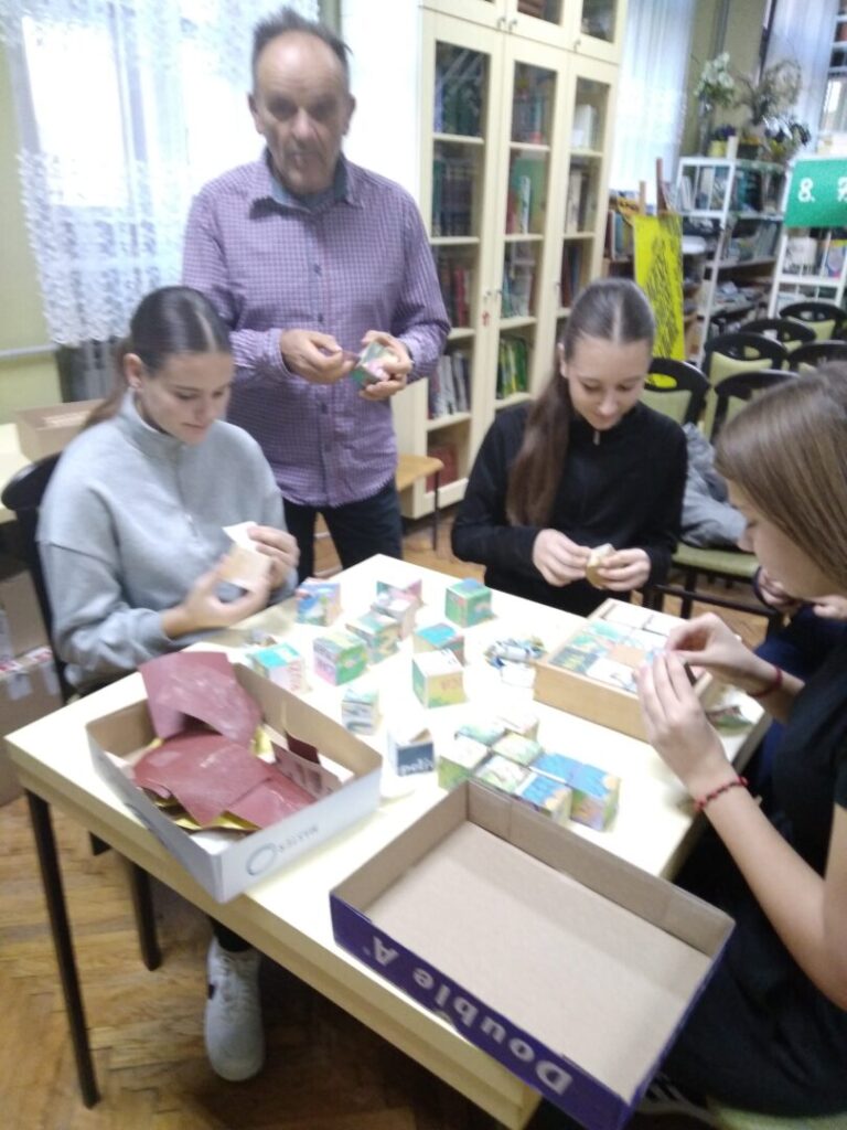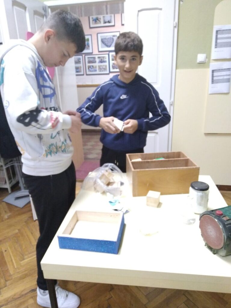 U našoj školskoj knjižnici održana je radionica na kojoj su sudjelovali članovi Zadruge, nastavnik Neven , voditelj Zadruge i knjižničarka Vlasta. Nastavnik Neven i vrijedni učenici pokazali su ponosno dva dvorca izrađena od drveta.