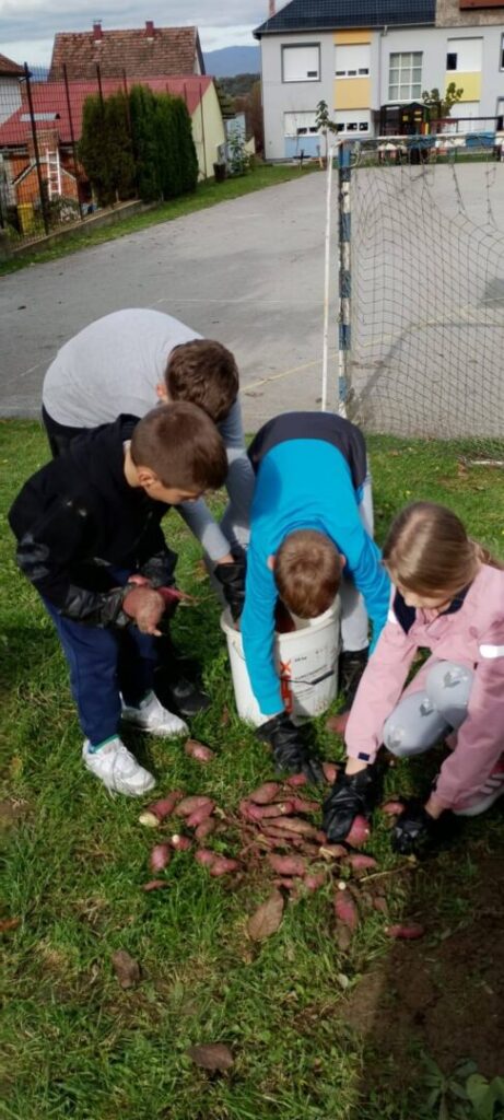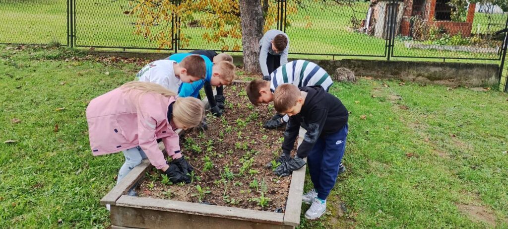 Naši mali vrtlari na satu Domaćinstva, uz pomoć učiteljice Barice Matijević, bili su jako vrijedni. Najprije su pripremili zemlju i posadili bijeli luk. Povadili su batat, posadili turski karanfil i pripremili zemlju za sadnju jagoda.