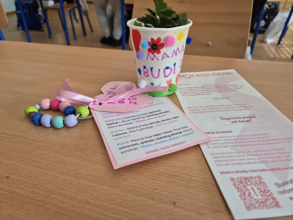 Osim cvijeća naši su prvašići sa svojom učiteljicom Vlastom Jezerčić za svoje mame izradili i “narukvice zdravlja” kako bi ih podsjetili koliko su im važne i koliko je njihovo zdravlje bitno. Nanizali su šarene perlice i napisali poruku svojim mamama. Boje na šarenim perlicama podsjetit će mamu da misli i na sebe.