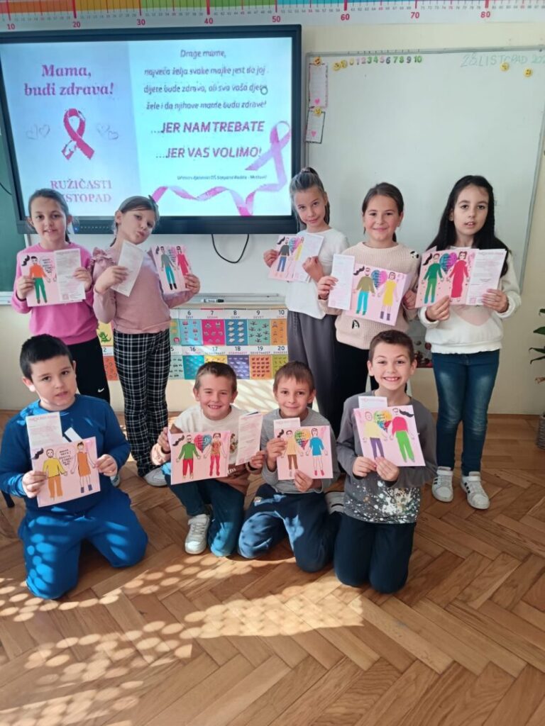 Tijekom Ružičastog listopada, mjeseca posvećenog borbi protiv raka dojke, naši su prvašići zajedno s pedagoginjom Ivanom Đimoti Vida sudjelovali u posebnoj aktivnosti u sklopu projekta „Mama, budi zdrava“.