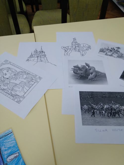ispričati priču s oslikanim motivima: kraljevići, kraljeva kći, dvorac, visoka kula, zmaj sa sedam glava,