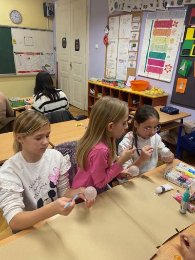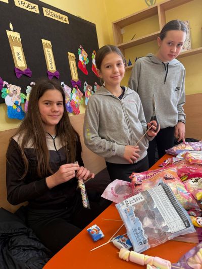 Učenici 5.c razreda imali su veselu radionicu s razrednicom Jelenom i učiteljicom Anom Perić, uz pomoći svojih roditelja. Izrađivali su slatke praline i osvježivače prostora s božićnim motivima.