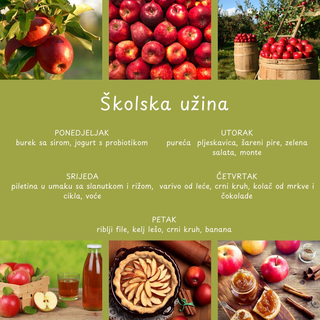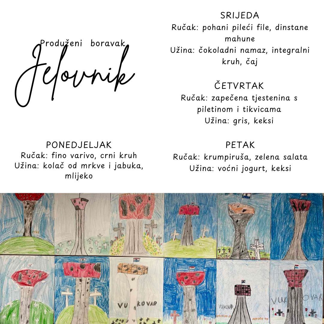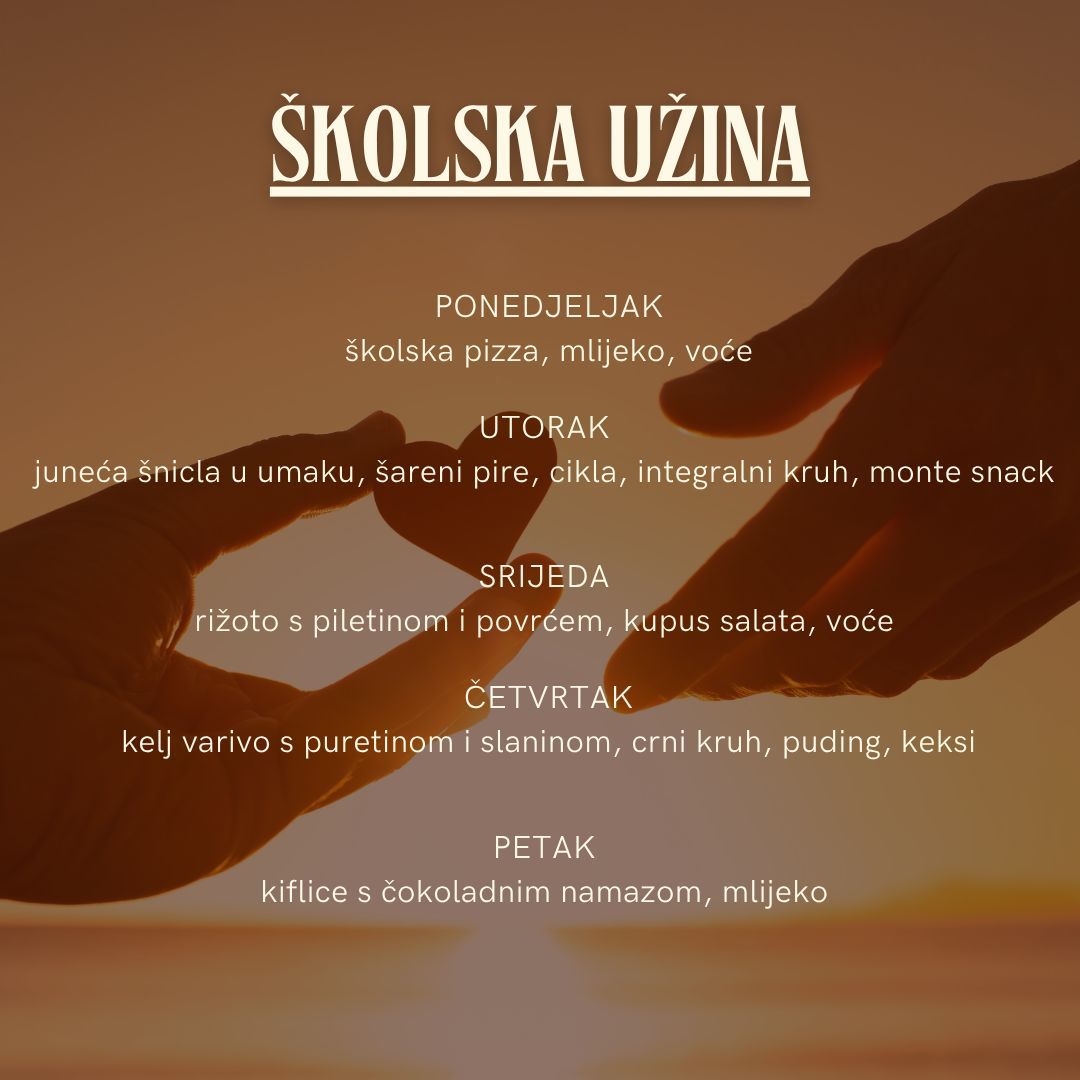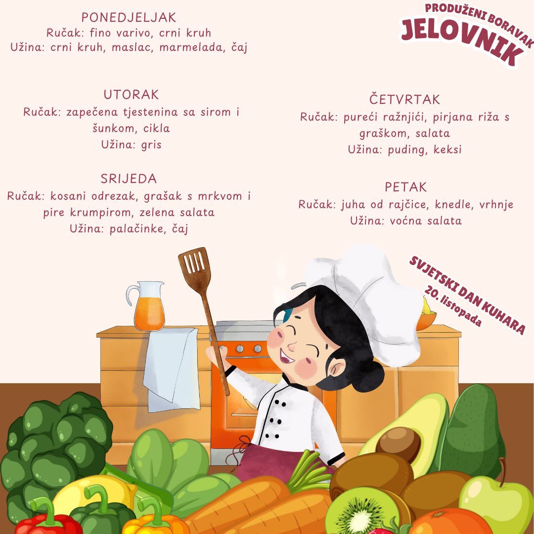 U našoj školi nastojimo svakodnevno učenicima ponuditi zdravu i uravnoteženu prehranu. Naše vrijedne kuharice pripremaju raznovrsne obroke koristeći zdrave namirnice. Tako se na jelovniku nađu juhe, variva, meso, riba, povrće… Djeci se redovito nudi i svježe voće. Na taj način trudimo se da djeca usvoje pravilne prehrambene navike, kao i pravila ponašanja za vrijeme objeda.