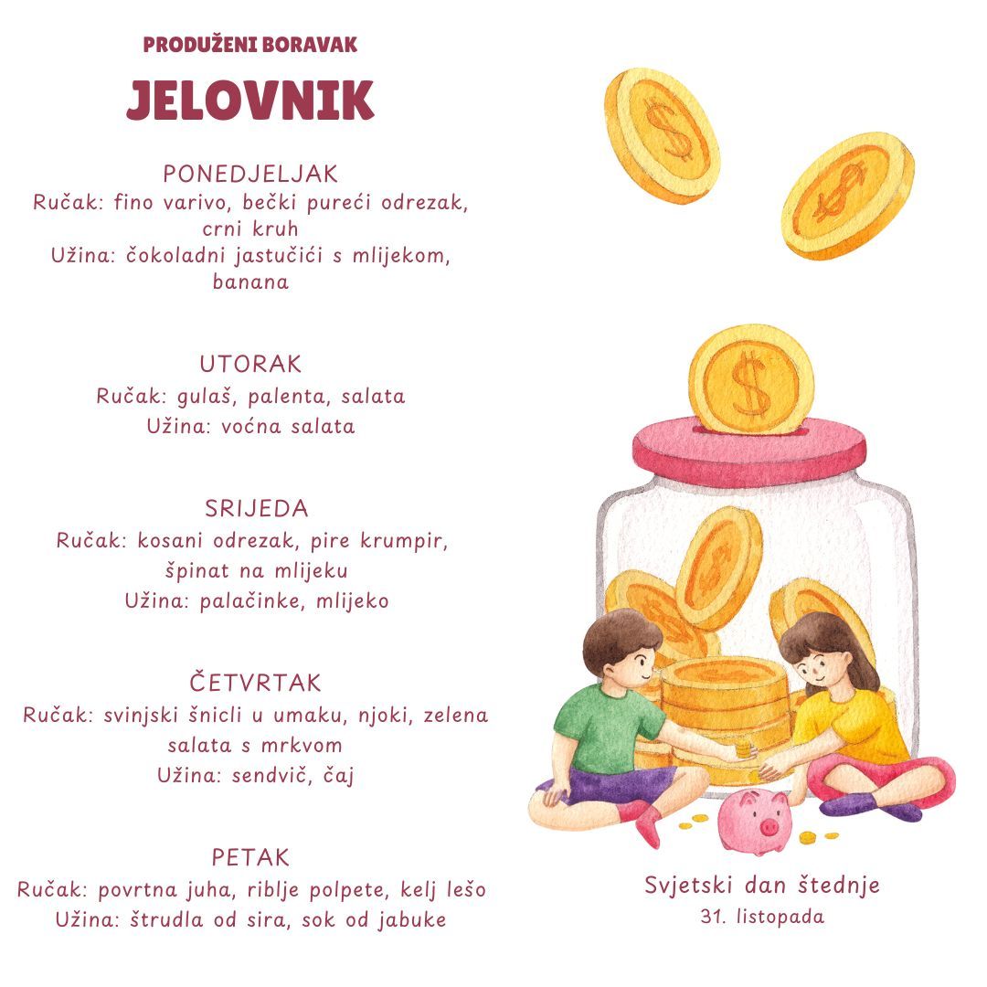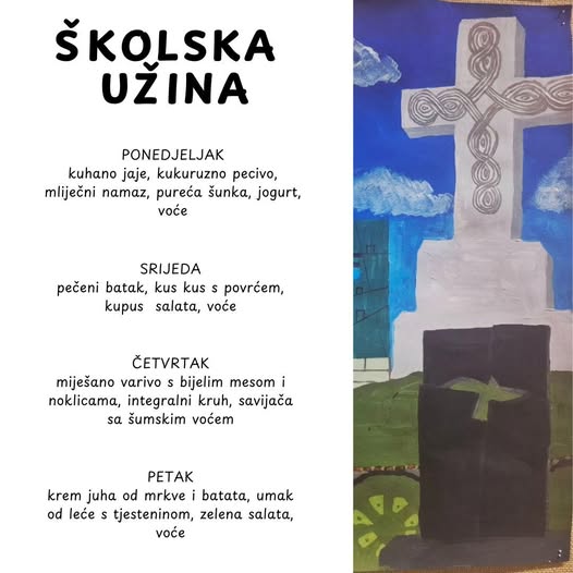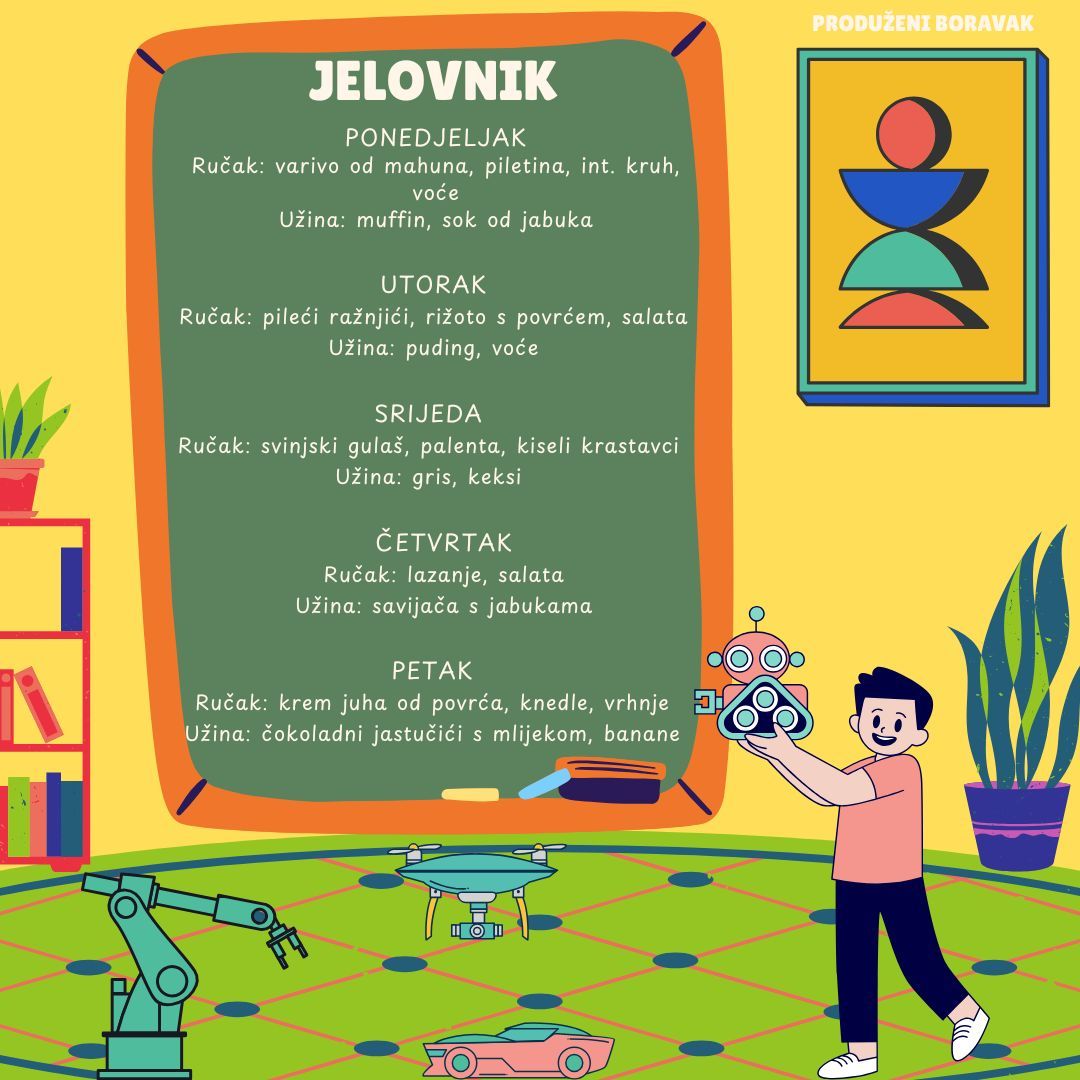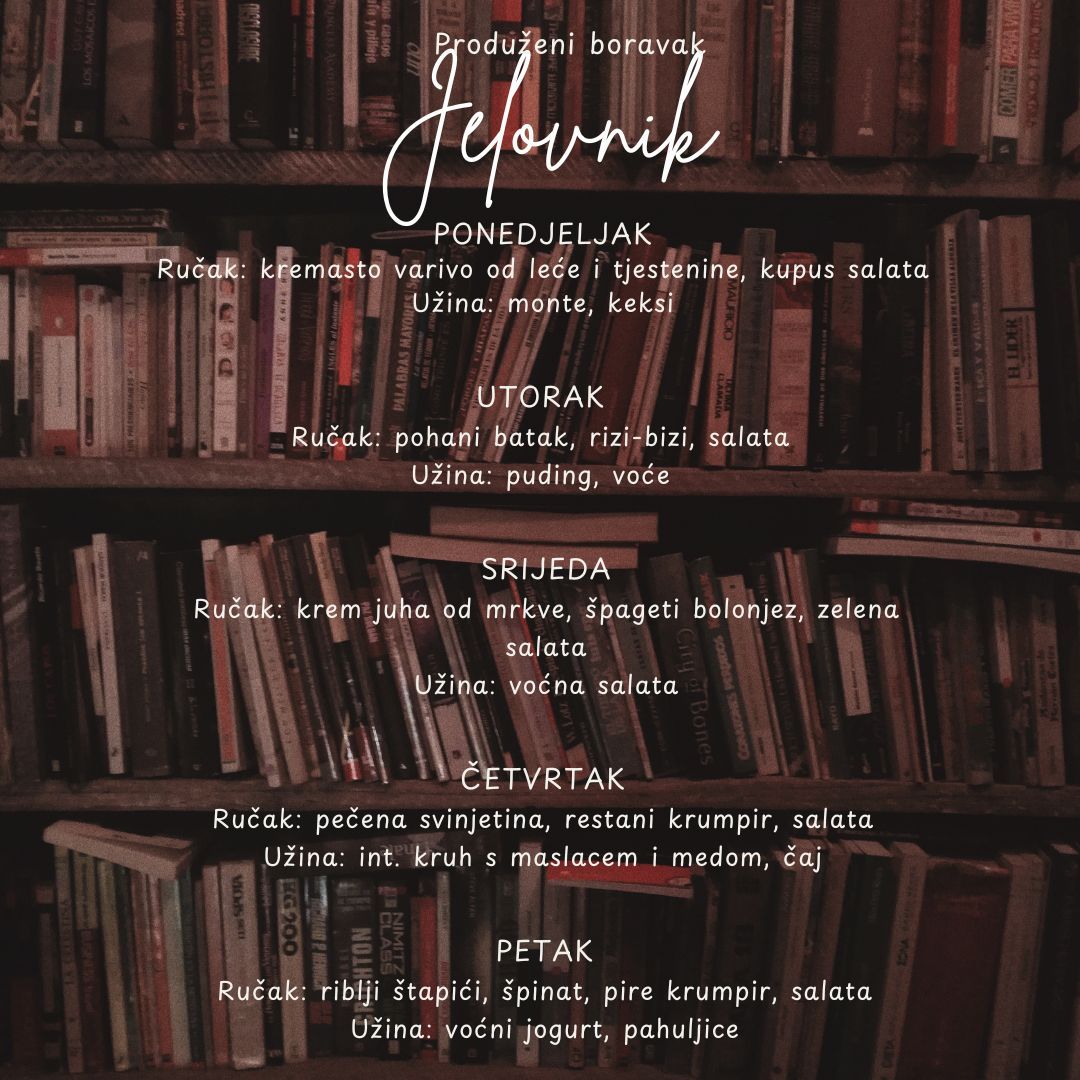 U našoj školi nastojimo svakodnevno učenicima ponuditi zdravu i uravnoteženu prehranu. Naše vrijedne kuharice pripremaju raznovrsne obroke koristeći zdrave namirnice. Tako se na jelovniku nađu juhe, variva, meso, riba, povrće… Djeci se redovito nudi i svježe voće. Na taj način trudimo se da djeca usvoje pravilne prehrambene navike, kao i pravila ponašanja za vrijeme objeda.